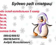 Маємо приміщення склад-холодильник з 5 камер висотою 9.40 м, здаємо в оренду: 216 м.кв, 108 м.кв, 120 м.кв, 120 м.кв, 120 м.кв.