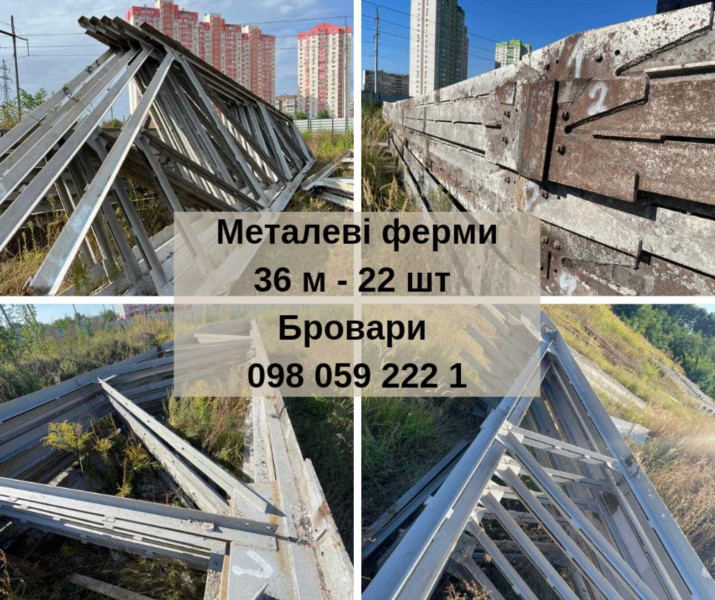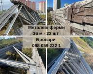 Продаж металевих ферм 36 м, в наявності 22 шт . Висота 4,50 м по краях 2,40 м. Виготовлені із металевого кутника 165, 125, 75, 90 , 110.Вага ферми 6,100 т, ціна вказана за тонну.