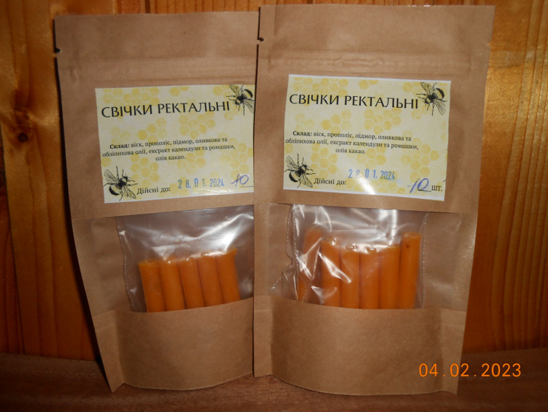 Склад: віск, прополіс, підмор, оливкова та обліпихова олії, екстракт календули і ромашки, олія какао. Показання: профілактика та лікування геморою, проктит, парапроктит, захворювання простати. Профілактика - по 1 свічці на ніч, лікувально - по 1 свічці ранком і ввечері; не менше 10 днів.