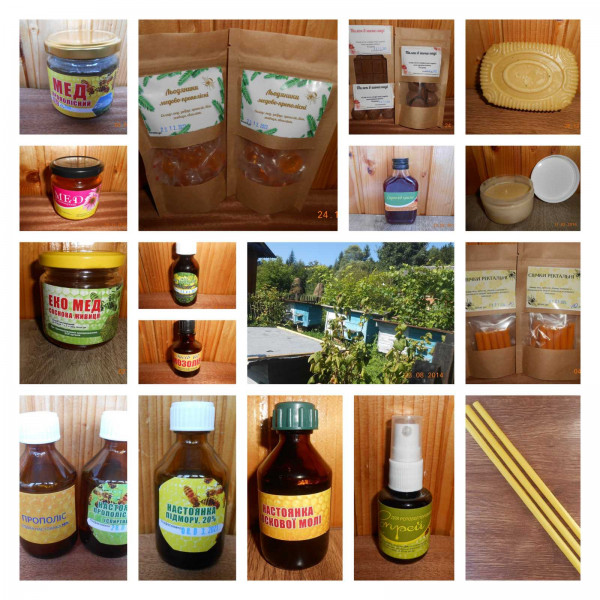 вушні свічки, ректальні свічки, настоянки воскової молі, прополісу, підмору, восковий брусок, спрей для ротової порожнини, льодяники медово-прополісні, пилок в шоколаді, мед з сосновою живицею, мед з ехінацеєю, мед прополісний, сироп від кашлю, засіб від мозолів, засіб від бородавок, прополісне масло.