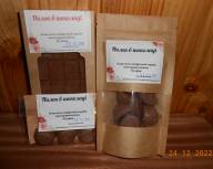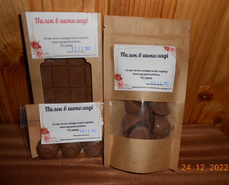 Склад: пилок, натуральний медовий шоколад ручної роботи (без цукру). Дія: покращує загальний стан, апетит, підвищує розумову і фізичну активність, витривалість, стійкість до стресів та захворювань. Ціна: цукерки (50 грам) - 97 грн., плитка (85 грам) – 170 грн.