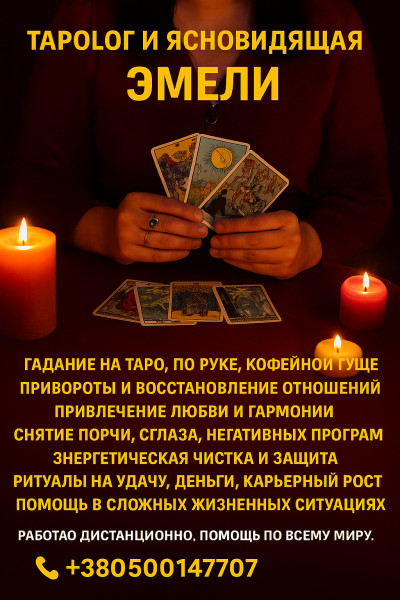 Эмели — опытный таролог, ясновидящая и экстрасенс, много лет помогая людям возвращать гармонию в жизнь. Её работа помогает разобраться в чувствах, понять причины трудностей и увидеть путь к переменам.