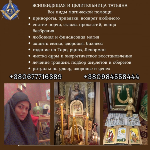 Ясновидящая в Киеве. Целительница в Киеве. Магическая помощь в Киеве. Гадания на картах Таро. Привороты и восстановление отношений. Снятие сглаза и порчи. Защита от негатива. Амулеты и талисманы. Финансовая магия. Обряды на деньги и успех. Лечение травами. Помощь при бессоннице. Работа с детьми. Энергетическая чистка. Диагностика и восстановление ауры.